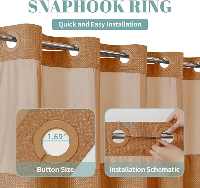 - 【Standard Size】:71"W x 74"L(same size as 71"Wx72"L hooked shower curtain) for shower curtain and 70"W x 54"L for snap-in liner.Fits most standard-sized bathroom