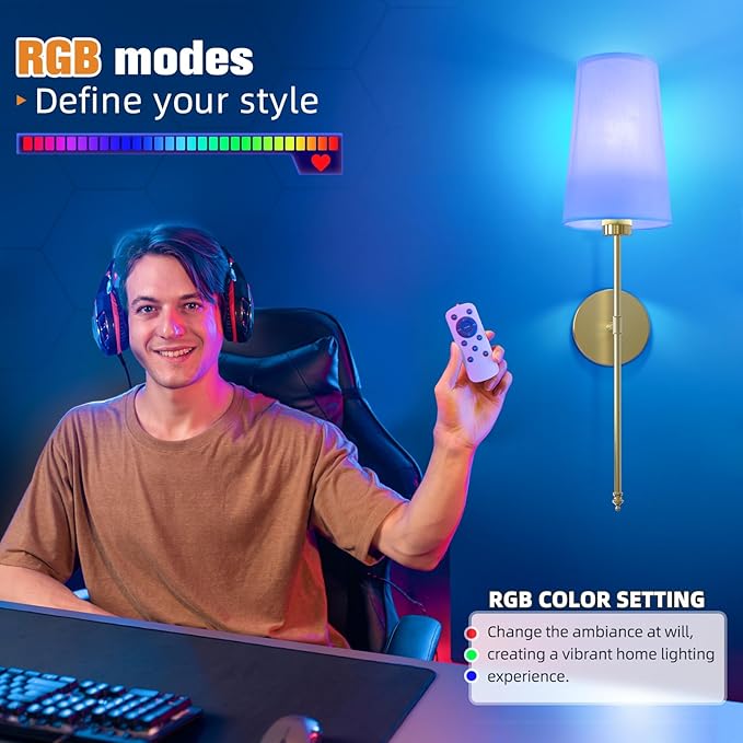 - 【Color Customized & Dimmable】Customize your lighting experience with adjustable color temperatures ranging from 3000K to 6500K and five levels of brightness (20%-100%),as well as 6 RGB colors.Whether you need warm, cozy lighting or bright, energizing illumination, our sconces wall decor set of 2 offer a comprehensive range of lighting options.
