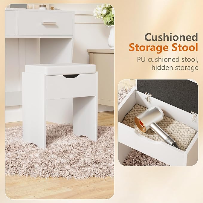 - Ample Storage Space: Featuring two spacious drawers, this vanity desk ensures all your beauty essentials are organized and within reach. The additional padded storage stool not only adds a cozy touch but also provides ample room to store your hairdryer, books, or any other personal items.