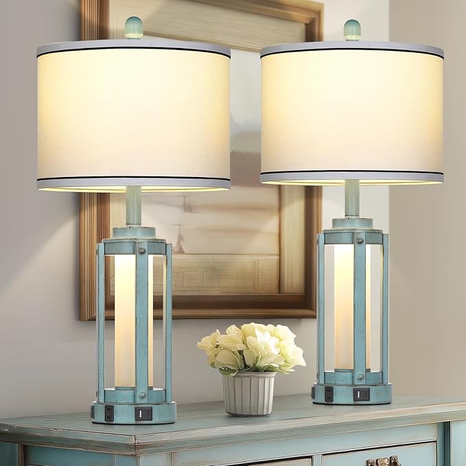 - Farmhouse Vintage Industrial Design:The lamp set of 2 offer a well-crafted rustic vintage design with a unique feature of dual night lights, making multiple lighting options. The pretty fabric lampshade complements the metal lamp stand, creating an elegant style with a warm 2700K glow. The lampstand's metal column and layered design allow the nightlight glow to warmly permeate, adding an comfortable vibe to your home space!