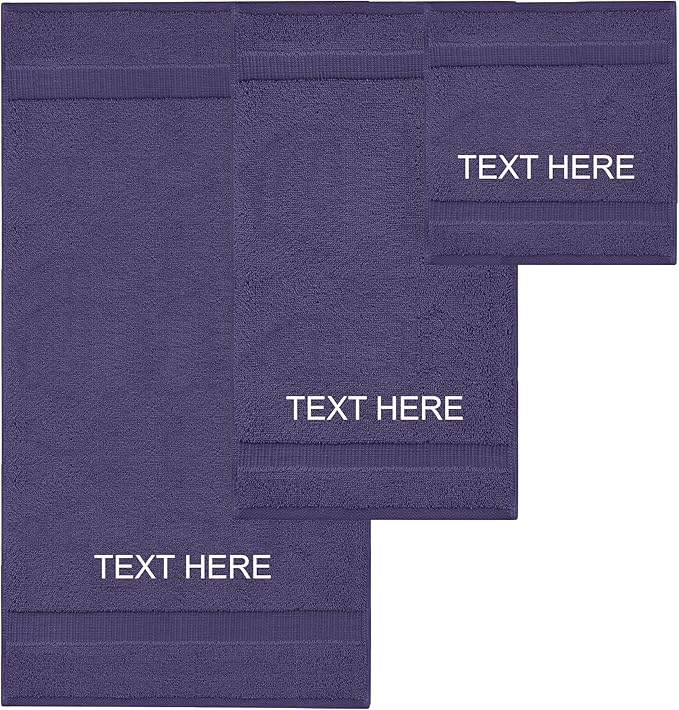 - SET INCLUDES: This set consists of a personalized bath towel (27 by 54 inches), a personalized hand towel (16 by 30 inches), and a personalized washcloth (13 by 13 inches). You can add names, initials, or any desired text to each towel. These excellent and functional measurements are ideal for everyday use. Perfect as a thoughtful gift or a stylish addition to your bathroom.
