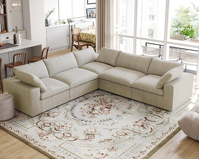 - ⛅[Comfortable Couch] Made of high-quality hemp velvet, the V shape 5-seat sectional couch is wear-resistant, wrinkle resistant, hard to deform, and as new as after long use. Built in pine frame for moderate softness and hardness, comfortable sitting, restoring natural relaxation.
