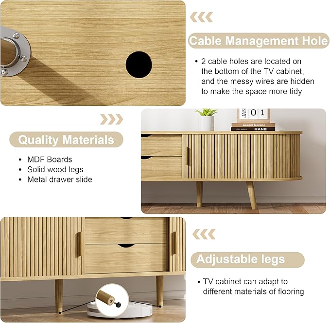 - 【Quality Materials & Thoughtful】This fluted wood TV stand is made of engineering boards and solid wood legs and wooden handles. The design of the inverted conical TV cabinet legs enhances the load-bearing capacity of the TV stand with sliding doors, making it more stable. The middle support legs are adjustable, allowing the TV cabinet to remain stable on uneven ground.