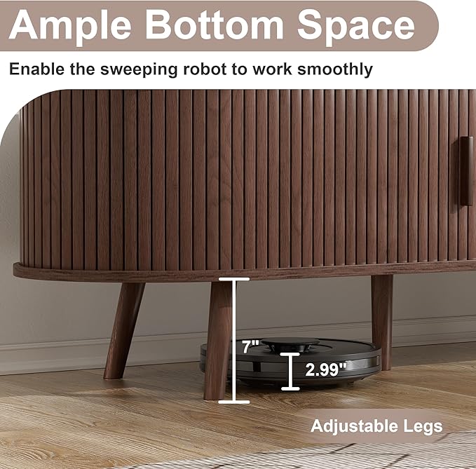 - 【Quality Materials & Thoughtful】This wood fluted TV stand is made of engineering boards and solid wood legs and wooden handles. The design of the inverted conical TV cabinet legs enhances the load-bearing capacity of the TV stand with sliding doors, making it more stable. The middle support legs are adjustable, allowing the TV cabinet to remain stable on uneven ground.