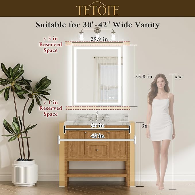 - 【High Brightness and Energy-Saving】The TETOTE led mirror for bathroom offers 9500 lux high brightness illumination, which is 18% brighter than the 8,000 lux of ordinary lighted mirrors. Certified by UL/FCC, the LED strip and driver functions stably, ensuring the lights are bright enough without flickering while being eye-protecting. Featuring eco-conscious upgraded structure, it saves 32.8% on your energy bills and significantly reduce carbon footprint