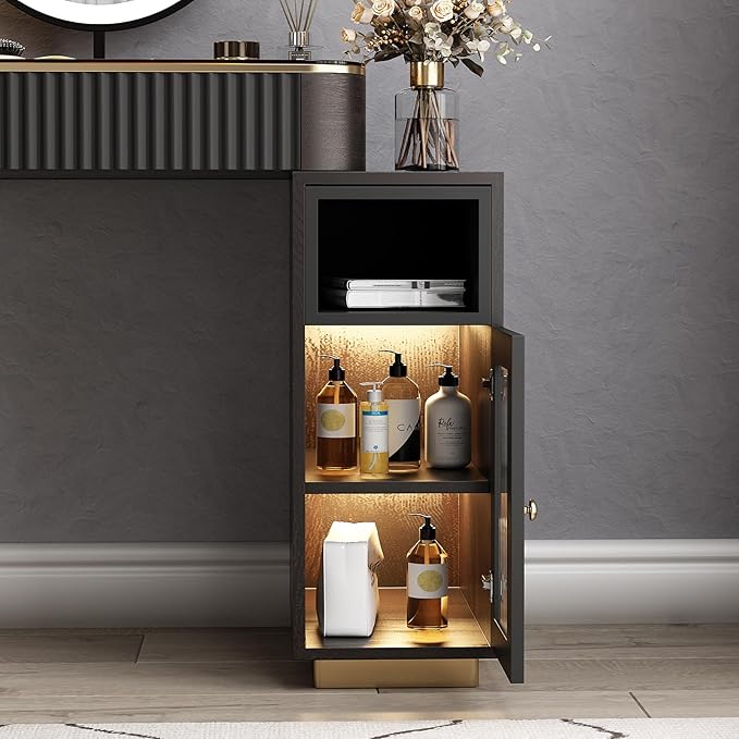 - đăOrderly and tidyă:Visible tempered glass countertop, with sensor light storage cabinets, no longer have to worry about finding items.