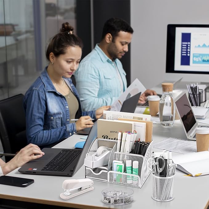 - VARIOUS OFFICE DESK ACCESSORIES:The set includes a total of 17 office supplies, with 3 office desk organizers and 14 other office tools: 4 ballpoint pens, 1 hole punch, 1 stapler, 1 box of 24/6 staples, 1 staple remover, 1 pair of scissors, 1 6.7-inch ruler, 1 box of clips, 1 roll of clear tape, 1 tape dispenser, and 1 sticky notes holder. This set is designed to meet all your daily office needs.