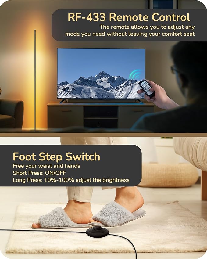 - [Remote Control & Foot Switch] Effortlessly adjust brightness and power with the RF-433 remote, offering a reliable range of up to 49 feet, plus a convenient foot switch for the black floor lamp