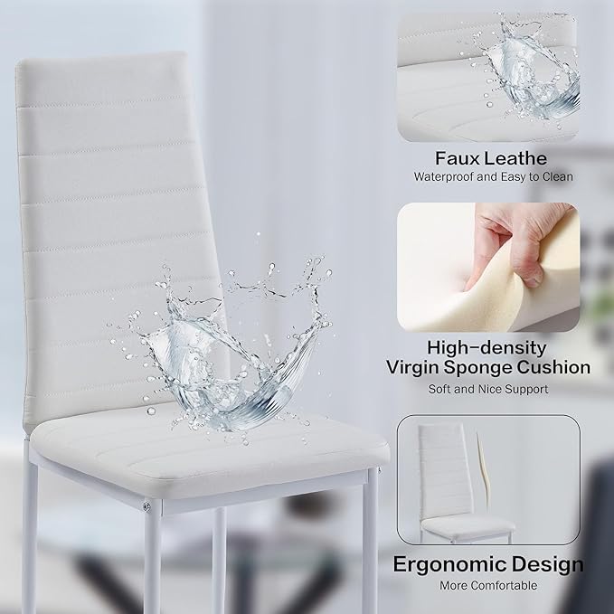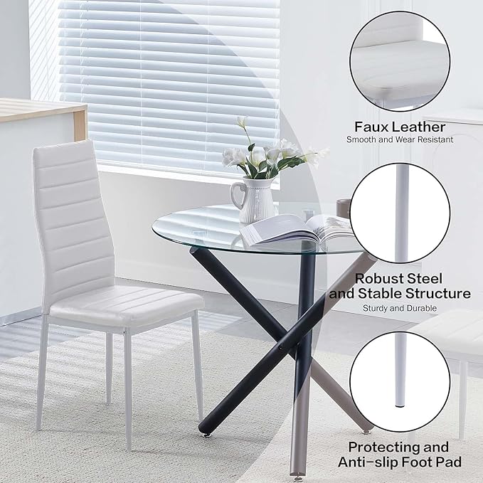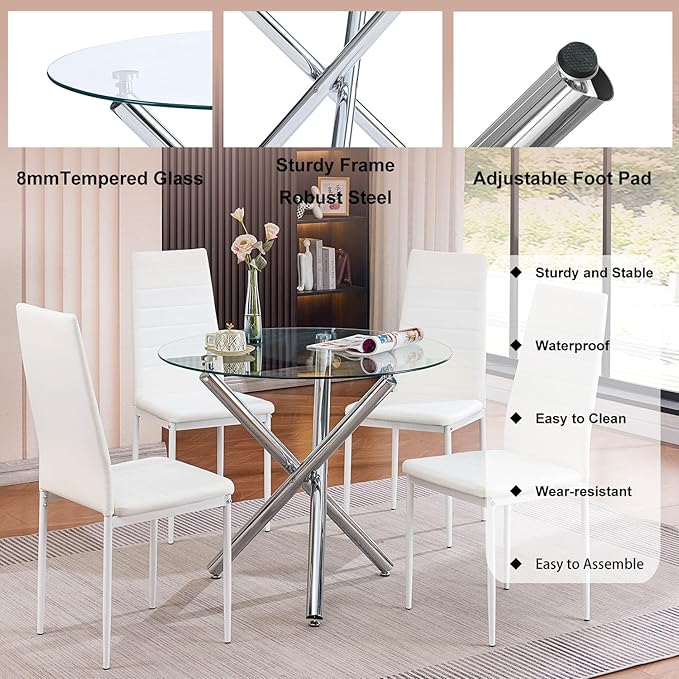 - 【Easy Assembly Round Glass Dining Room Set for 4】With its straightforward design, assembling our round glass dining table set of 5 is a breeze. All necessary screws and tools are conveniently packaged in the box, and with detailed instructions provided, assembly typically takes less than 20 minutes. The tempered glass tabletop and durable faux leather of the chairs are both waterproof and resistant to dirt. All you need to clean the glass dining table set is a damp cloth.