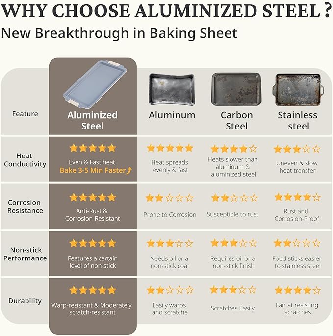 - Upgrade to Heavy-Duty Aluminized Steel: Enjoy 50% more durability and 70% better heat distribution with our 0.6mm thick heavy-duty aluminized steel baking trays for oven. With superior rust resistance and nonstick performance, these trays outshine aluminum, carbon steel, and stainless steel. They can withstand up to 500°F, ensuring perfect baking results every time.