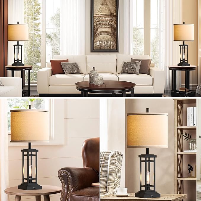 ROTTOGOON 27.5 Tall Farmhouse Table Lamps with USB C + USB A Charge Ports, Rustic Living Room Lamps Set of 2, Black Industrial End Table Lamp for Bedroom Living Room Nightstand (Black)