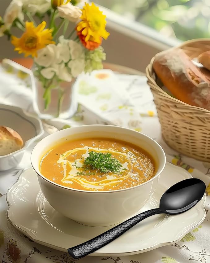 - Premium Heavy Duty Forged Crafted: Black Flatware Set made of advanced forge craftsmanship process, which offers a unique double-sided hammered-through handle with graceful curves. Combine multiple times finely polished for smooth edges. And made of quality food-grade stainless steel to resist rust and corrosion, enhancing this black utensil set durability, it will not bend or chip in daily use, ensuring the longest-term value and optimal performance for use.