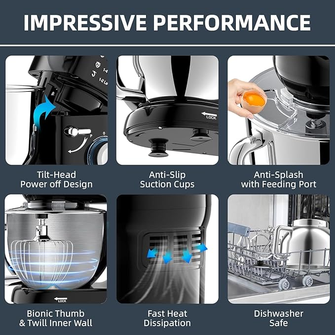 - 🍕【TILTING HEAD DESIGN AND SAFE ADJUSTMENT】 The tilt-head design mixer allows access to install or uninstall bowl and accessories easily. When the tilting head is raised, the electric kitchen mixer stops working automatically. In the event of a serious overload, it can be switched off intelligently. 6 non-slip silicone pads on the bottom ensure that the pastry blender remains stable even at high speeds.