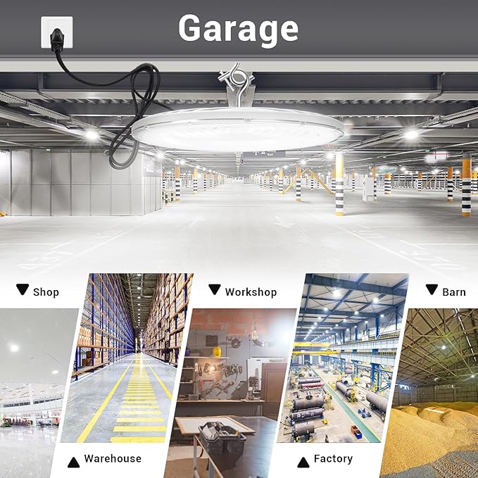 - 【Easy & Quick Installation】This UFO Led High Bay Light can be easily installed in seconds with the 5FT power cord provided and the built-in hook. It comes with US plug with which you can plug to the power directly, safe and secure for extremely easy installation. Ideal indoor lighting,This LED highbay light can work under power supply of AC 120V