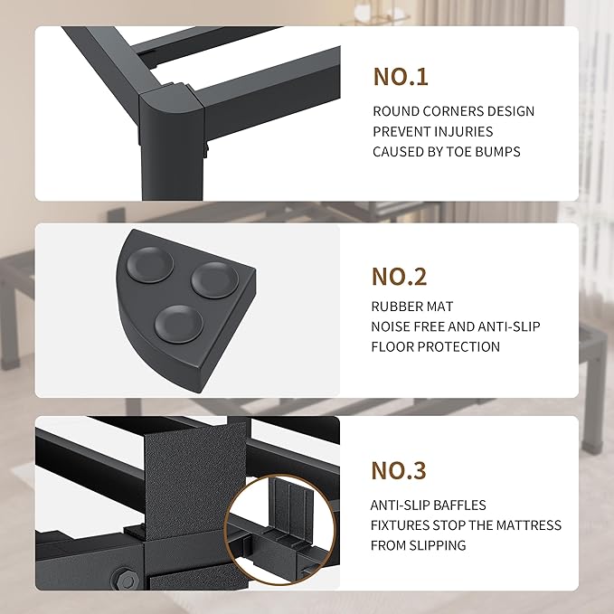 - ANTI-SLIP DESIGN - The king platform bed frame has extra plastic anti-skid baffles on all four sides to prevent the mattress from slipping, as well as rubber foot cushions to prevent the king metal bed frame from sliding and protect the floor from scuffing while reducing noise.