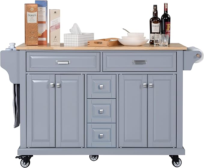 Generic 60.5"" Kitchen Island on Wheels, Rolling Island Table for Kitchen with Double Storage Cabinet and 5 Drawers, Portable Kitchen Cart with Rubber Wood Top, Grey, Large