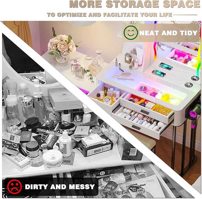- 【3-in-1 Charging Station】The dresser is equipped with a wireless charging station and 1 USB + 1 TYPE-C port, which makes charging your phone/headphones more convenient and allows you to enjoy the whole make-up process more.