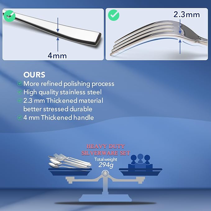 - 【Silverware Set for 4】This forks and spoons silverware set includes 4 of each: Dinner Knives, Dinner Forks, Dinner Spoons, Salad/Dessert Forks and Dessert/Tea Spoons, well packed in a nice cardboard box. It’s the ideal flatware set for home daily use, and also for restaurants, pubs, cafes, and hotels. This cutlery set also helps your dinner be full of design while having a party