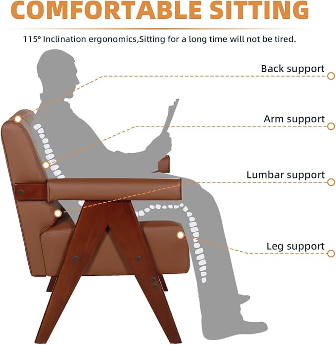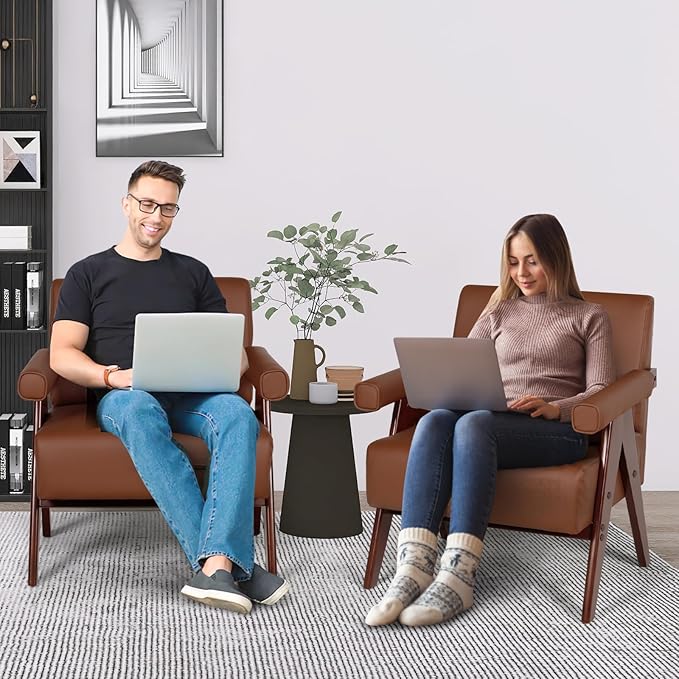 AODAILIHB Mid Century Modern Chairs Brown Leather Accent Chair Wood Arms with Soft Bag Living Room Chairs with Thick Cushion Comfy Leisure Sitting Waiting Room Chairs Bedroom/Office (1, Brown)
