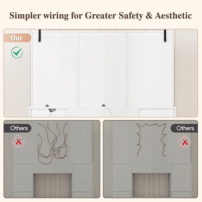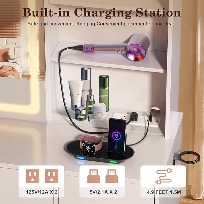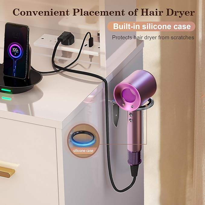 - Convenient Charging Station: The makeup desk is equipped with 2 USB ports and 2 AC power outlets, eliminating the need for extra power strips and preventing cable clutter. You can easily charge your phone while doing your makeup or working, ensuring you never leave home with a low battery. The fixed hairdryer holder also makes it convenient to find your hairdryer when you need it, saving you time and hassle