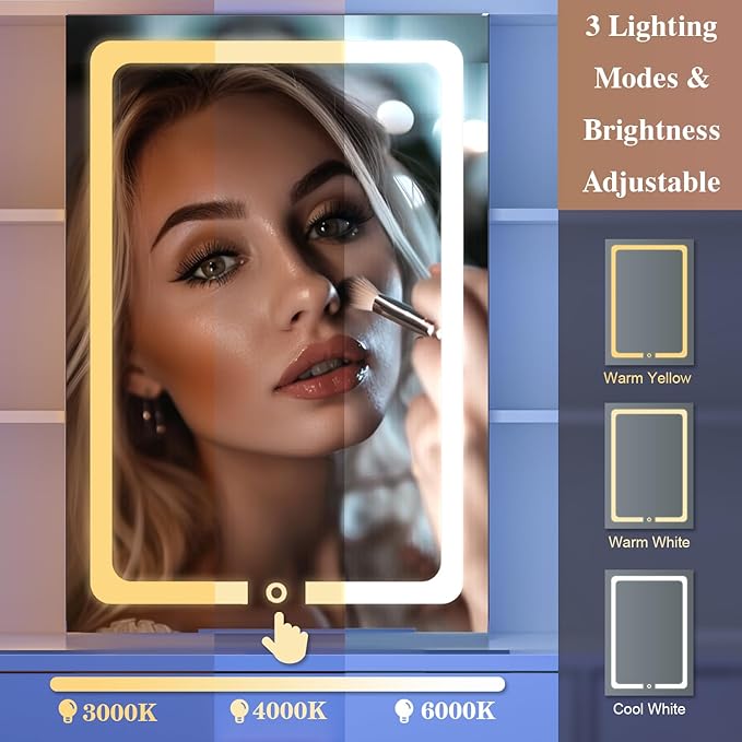 - Makeup Assistant: This makeup vanity table is equipped with LED illuminated mirror with three lighting modes: warm yellow, warm white and cool white, you can switch the color by touching it and long press can adjust the brightness of the light. The LED mirror can solve the problem of mismatched lighting & insufficient brightness when doing makeup, helping you to create perfect makeup easily. And this mirror can be moved, there are 2 shelves at the back, which can fully expand the storage space