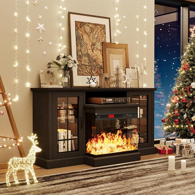 oneinmil Fireplace TV Stand with 3-Sided Glass, TV Cabinet for TVs up to 65", 59'' Modern Media Entertainment Center with Farmhouse Glass Door Storage Cabinets, for Living Room, Black