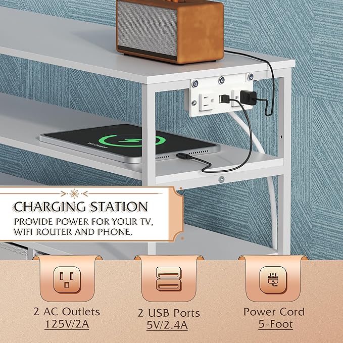 - ă⨠With Power OutletăSay goodbye to messy wires! TV stands is equipped with 2 AC sockets +2 USB ports, 1.5m flexible cable length, TV, game console, router a power board can be done, instant increase desktop cleanliness by 50%, through UL/ETL certification, electricity safety!