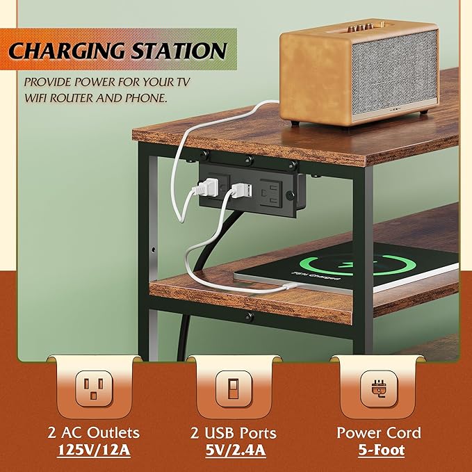 - ă⨠With Power OutletăSay goodbye to messy wires! TV stands is equipped with 2 AC sockets +2 USB ports, 1.5m flexible cable length, TV, game console, router a power board can be done, instant increase desktop cleanliness by 50%, through UL/ETL certification, electricity safety!