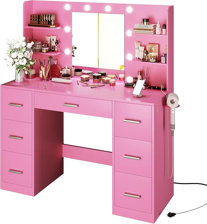 YESHOMY Vanity Desk with Mirror, Power Outlet and 10 Lights, Makeup Table with 7 Drawers, 3 Color Modes Available for Bedroom, Light Pink