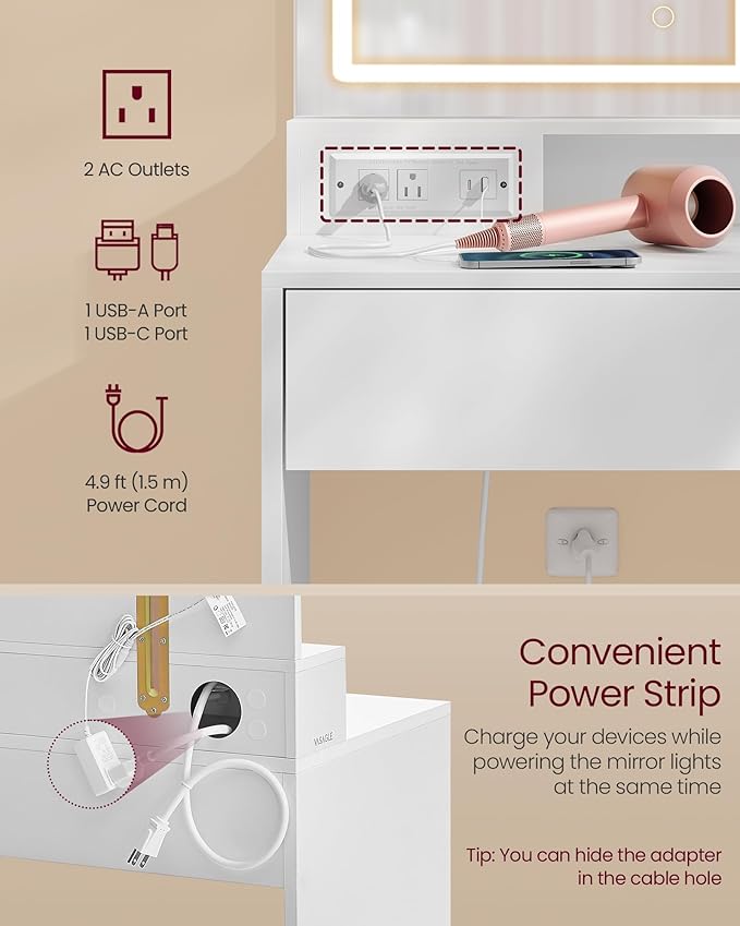 - Convenient Charging Station: This vanity desk includes 2 AC outlets, 1 USB-A port, and 1 USB-C port for conveniently charging your phone or powering beauty tools. The mirror's light is cleverly wired into the strip, freeing up an outlet for other devices