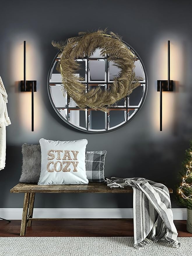- 【Modern Battery Operated Wall Sconce】This LED sconces wall decor set of 2 features a matte black finish and 30.7 inch simple metal lines, minimalist design bring a modern feeling, fits most décor style. It adds an elegant and cozy ambiance to indoor spaces such as living rooms, bedrooms, hallways, and entryways.