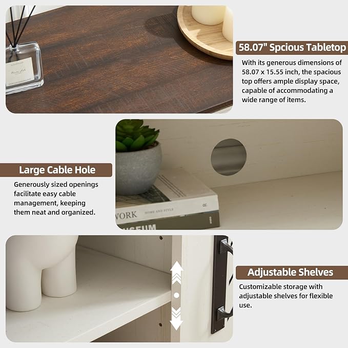 - Farmhouse Style TV Stand:Suitable for TVs up to 70 inches, with a 58" wide tabletop.Embrace rustic charm with this Minifeel TV stand designed for bedrooms, featuring a charming adorned with retro metal accents. Its one of a kind appearance, characterized by natural variations in grain patterns, hues, and textures, seamlessly blends country style into your living space, harmoniously pairing with other pieces from the Minifeel living room furniture collection.