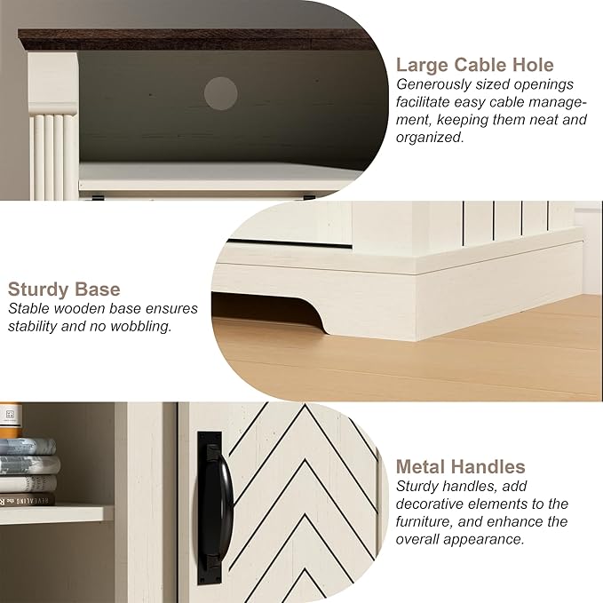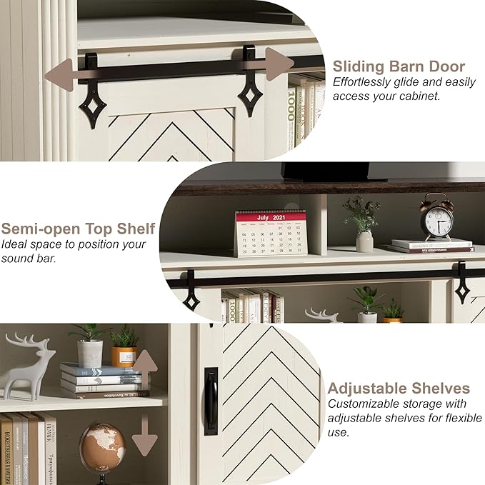 - Versatile Storage Solutions:Crafted with practicality in mind, this TV stands for living room boasts adjustable end shelves for tailored storage needs. The spacious 6.54" fixed middle shelves accommodate media devices effortlessly. The dual sliding barn doors grant you control over access, allowing you to conceal clutter by sliding them over the ends, transforming the space into hidden storage compartments.