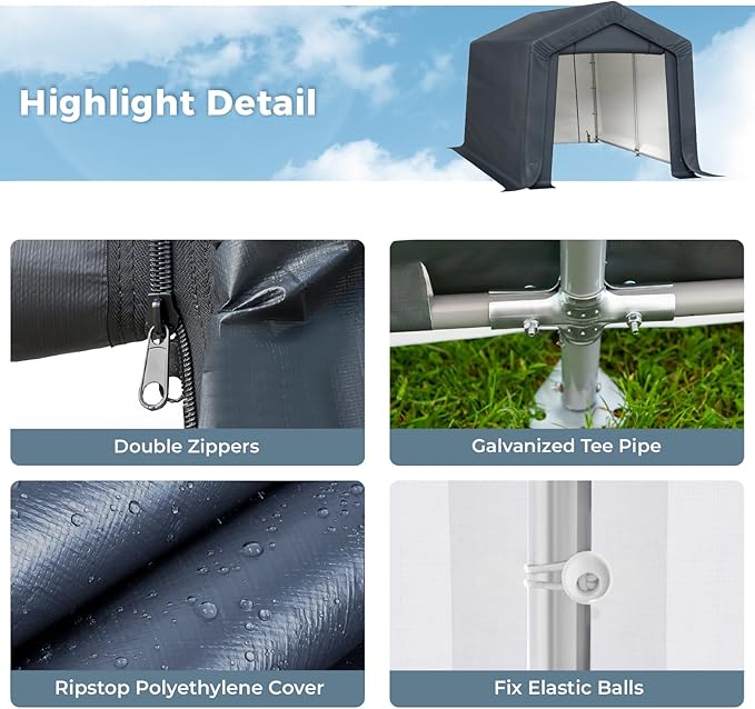 - 【Enhanced Durability with Galvanized Tubes 】Our storage sheds boast a heavy-duty, rust-resistant galvanized steel framework and metal corner joints. The galvanization process ensures protection against chipping, peeling, rust, and corrosion. Plus, the tool-free frame design allows for swift and effortless assembly.