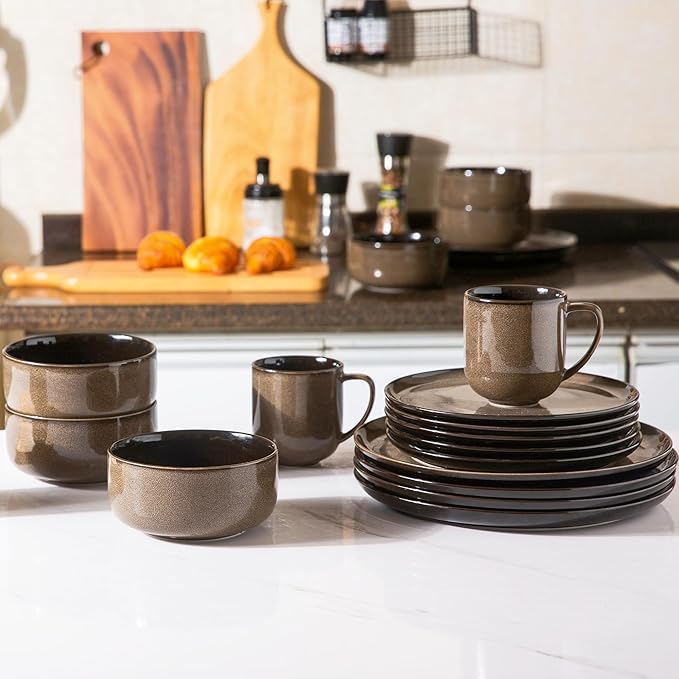 - 【 ELEGANT AND STYLISH DESIGN 】This dinnerware sets leads the dining trend with its expressive colors and finishes. With its vibrant color palette and captivating finishes, it creates an alluring ambiance that exudes warmth. The eye-catching reactive glazes and rich, vivid hues not only soothe the senses but also elevate your dining experience. The generously-sized plates provide ample space for displaying your delectable creations, while their deep bottoms prevent any sauce from spilling over.