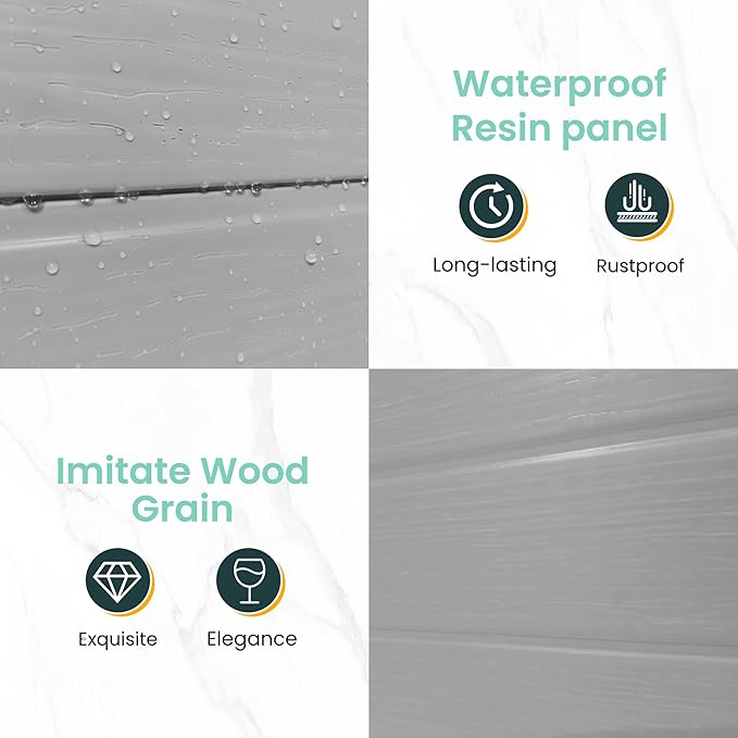 - RESIN MATERIAL:Our storage shed is crafted with 12 MM premium polypropylene resin plastic, which is recyclable. Resin shed is corrosion-resistant, waterproof, rustproof and with UV protection for more than 8000 hours, less bending and puncturing, worry-free for use in all weather conditions. It can be used daily for five years without fading