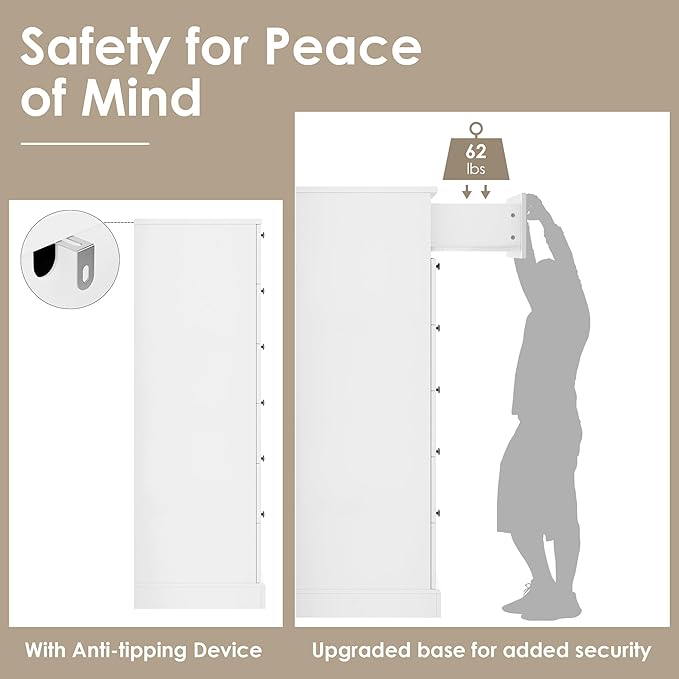 - 【Built To Last】Crafted from high-quality engineered wood and smooth-gliding rails, this wood dresser is specifically designed for long-lasting use. The upgraded base provides top security and each drawer supports up to 22 lbs, top surface holds up to 275 lbs