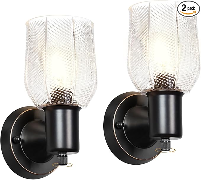 Wall Sconces Set of 2 - Matte Black Vanity Lights for Bathroom Modern Wall Light Fixtures with Rotary Switch - Wall Mount Light with Stripe Glass,Farmhouse Wall Lamp for Bedroom Mirror Living Room