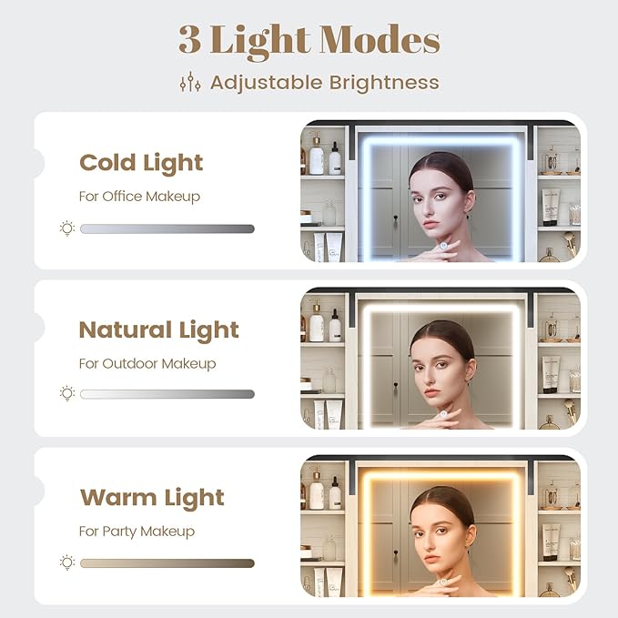 - 【3 Lighting Modes & Brightness Adjustable】The makeup desk is equipped with a large mirror and built-in LED light, offering 3 different color modes (warm yellow, warm white, and cool white) to provide soft and non-glare light. The brightness can be adjusted by long pressing the button to meet different brightness needs, creating the perfect lighting when applying makeup or hair styling, and avoiding blinding light.