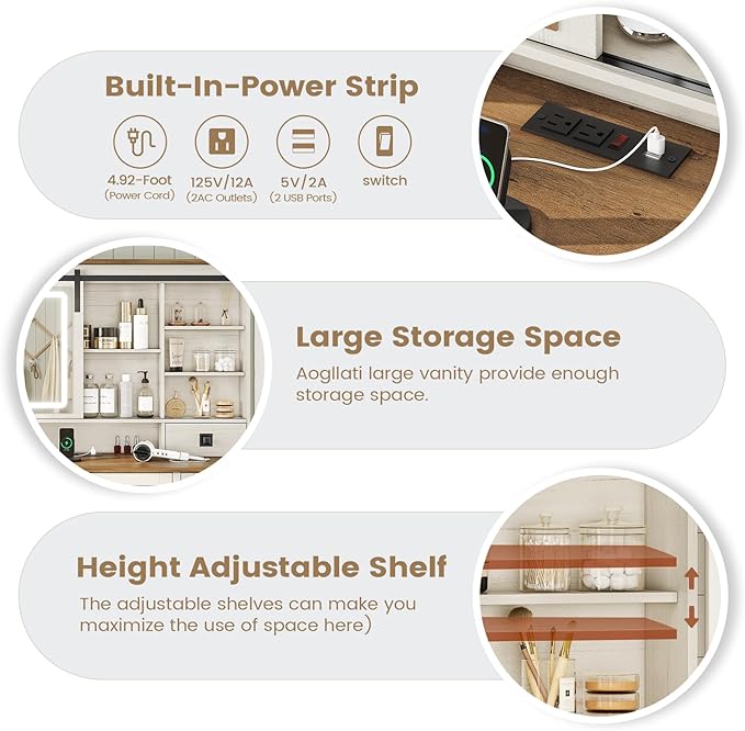 - 【Vanity Desk with Charging Station】AOGLLAIT vanity features a charging station above the tabletop, including 2 standard plug sockets and 2 USB ports, so all your mobile phones, tablets, hair dryer, curling iron, and other small electronic devices can be within arm's reach. You can sit directly in front of this makeup vanity with lights to easily use the curling iron or hair dryer to style your hair.