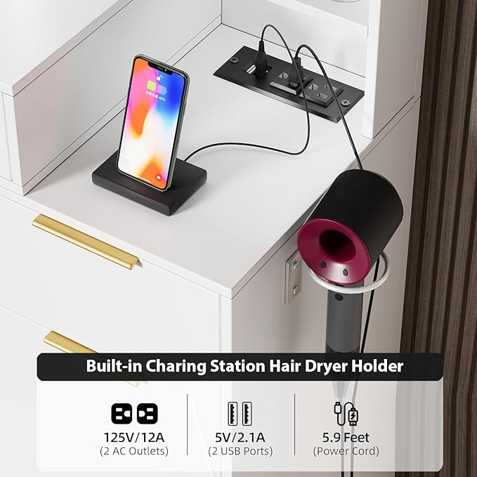 - 【Vanity Table with Charging Station】- This make up vanity adds an upgraded design with 2 standard plug sockets, 2 USB ports and hair dryer holder, allowing you to sit at your vanity and use your hair dryer or curling iron with the power strip within easy reach. It also provides great convenience for charging mobile phones, tablets, headphones or other mobile devices.