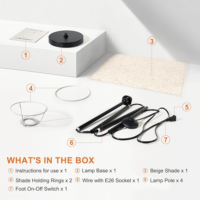 - The floor lamp itself is pretty basic with a foot switch(turn On/OFF), an E26 bulb socket and a Beige Lampshade & black Lamp Pole. Ideal for gifts!