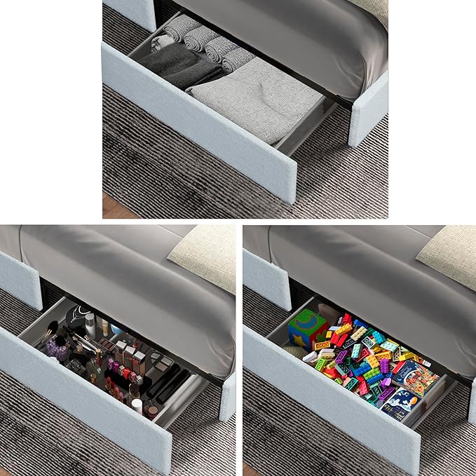 - PATENTED DRAWER SYSTEM:Our utility patented drawer system boasts a resilient metal construction providing a 40LBS weight capacity per drawer. Drawer dimensions are 29.5" x 19.3" x 5.9", with a total of 4 under-the-bed drawers, 2 plastic-lined drawers on each side of the bed.