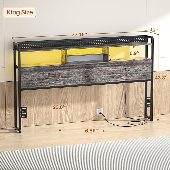 - 【Large Storage Space & Classic Design】The king size headboard comes with 3-tier storage shelves which are designed for storing cell phones, alarm clocks, books, and some other personal belongings to keep your room looking organized, creating a clean and comfortable sleeping environment. The unique thoughtful guardrail, exquisite wood panel with black iron frame showcases a strong retro color.