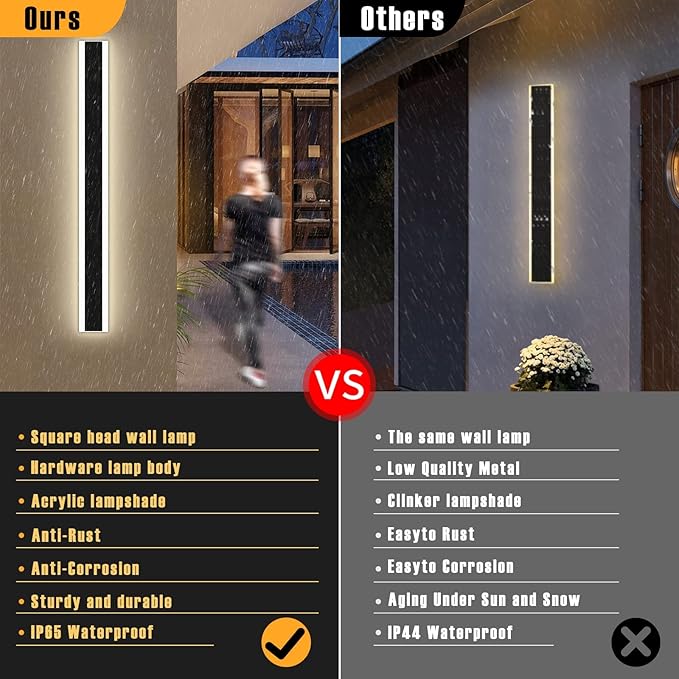- 【High Quality Material】Modern outdoor wall lighting Made of high quality iron material and high translucent acrylic lampshade, even light transmission, corrosion resistance, wall lamp life up to 50,000 hours. Aluminum alloy LED driver, with short-circuit protection design, overload protection design to ensure that it can be used safely.