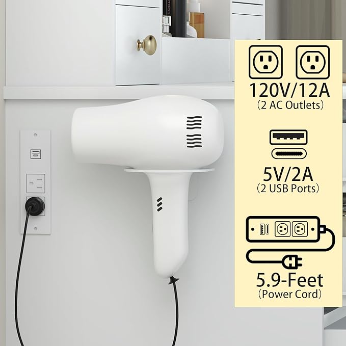 - 【VANITY WITH POWER OUTLET】Vanity desk adds 2 standard plug sockets, 2 USB ports, and a hair dryer rack, which makes ladies' life much easier. White vanity with charging station is convenient to charge the beauty device and phone, such as hair dryer, curling iron, other beauty electric tools. Starting from actual needs, our vanity mirror with lights desk and chair consider the daily needs of women and girls.