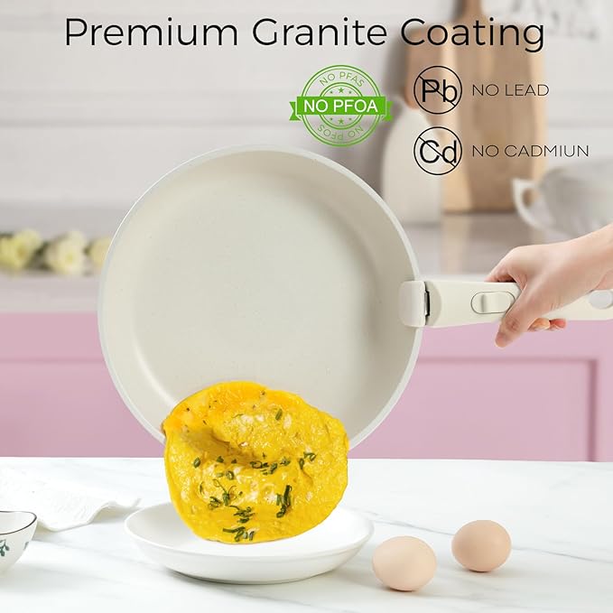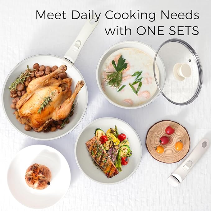 - Space-Saving Design: Pots and pans with detachable handles allow for compact nesting, optimizing 75% kitchen cabinet space and providing a healthy cooking environment,making for easy storage in cabinets or RVs.