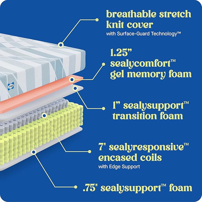 - 1.25” SEALYCOMFORT GEL MEMORY FOAM: This cushioning gel memory foam layer conforms to the shape of your body, providing tailored pressure relief and support where you need it most