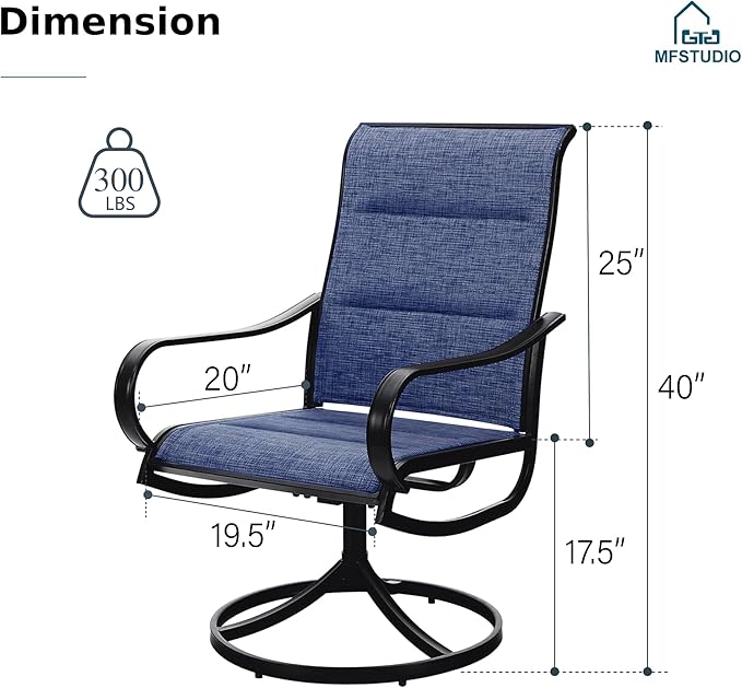 - HIGH BACK SWIVEL CHAIRS - The patio chairs can swivel 360 degrees smoothly, which allows you to chat with your families and friends without moving them. In addition, the chair features slight rocking. Ergonomic high back and curved armrests make the patio chairs more comfortable