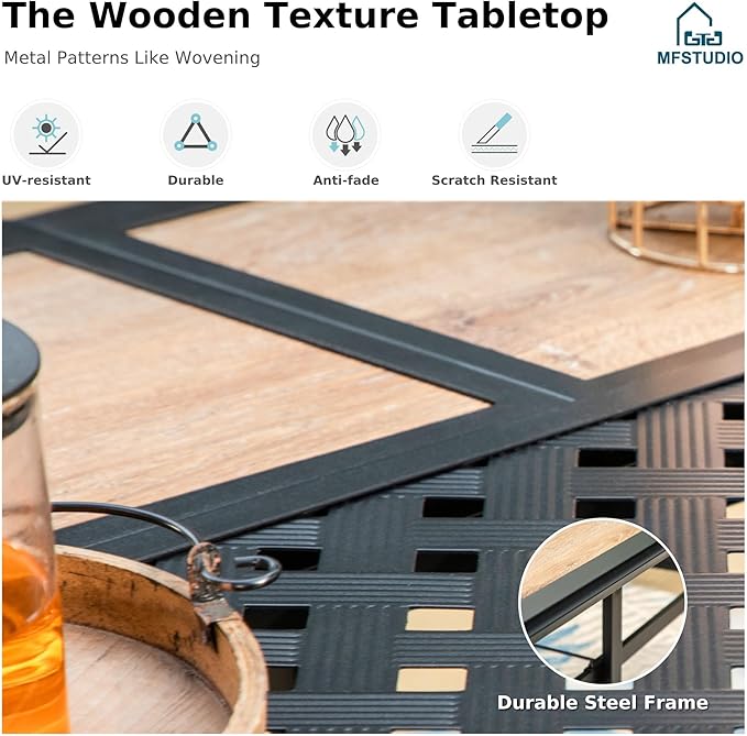 - BEAUTIFUL TABLE - The spliced wood-grained boards and hollowed metal plates make for a very stylish and unique tabletop, adding elegancy to your patio. The umbrella hole for installing patio umbrella,fits up to 1.6"- 2" diameter umbrella pole
